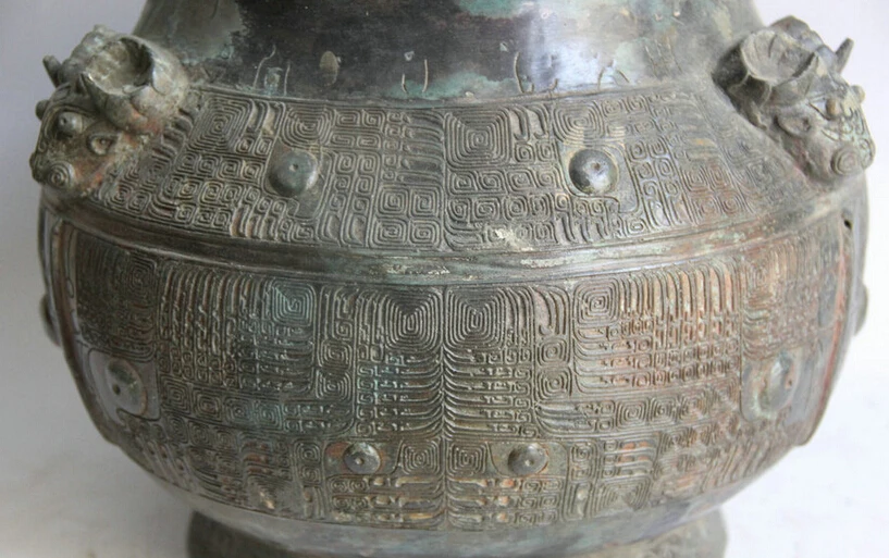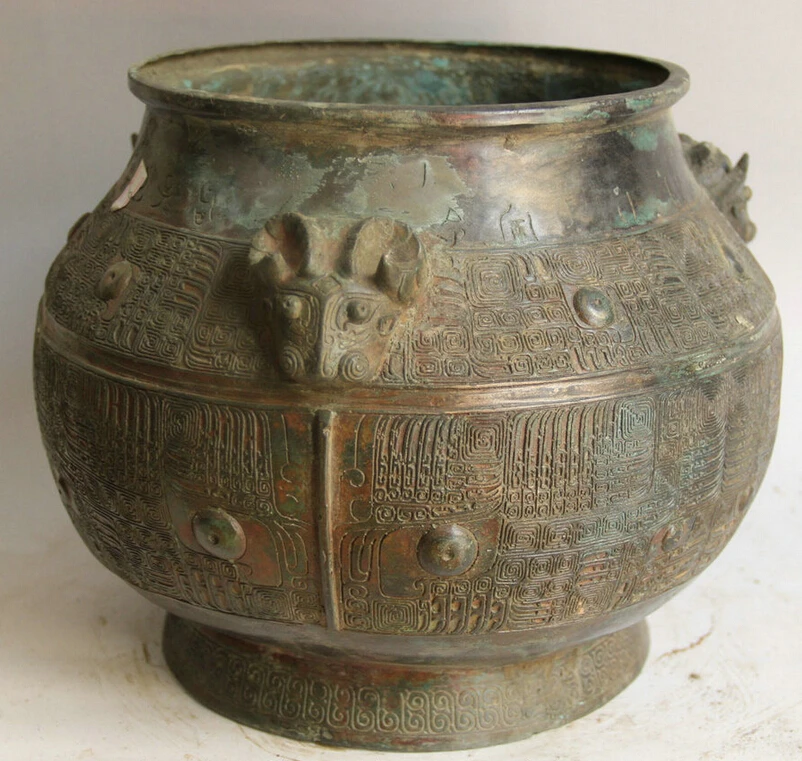 Elegant old S2199 12" Old Chinese Bronze circular word Sheep Head food water vessel Pot Jar Crock s